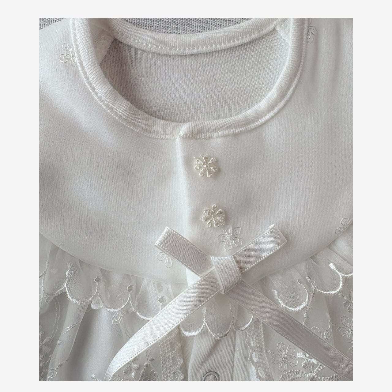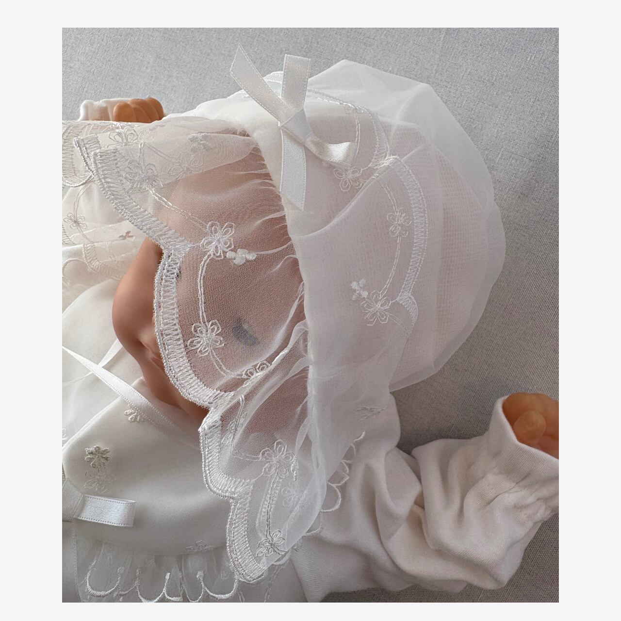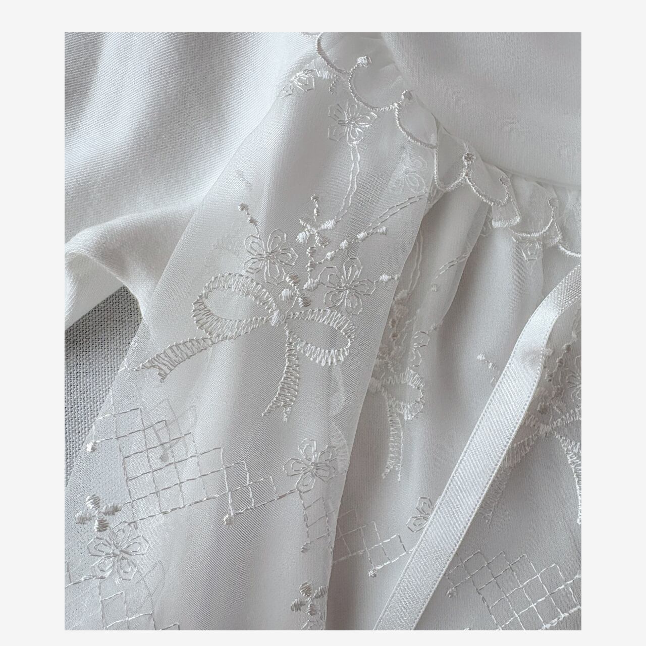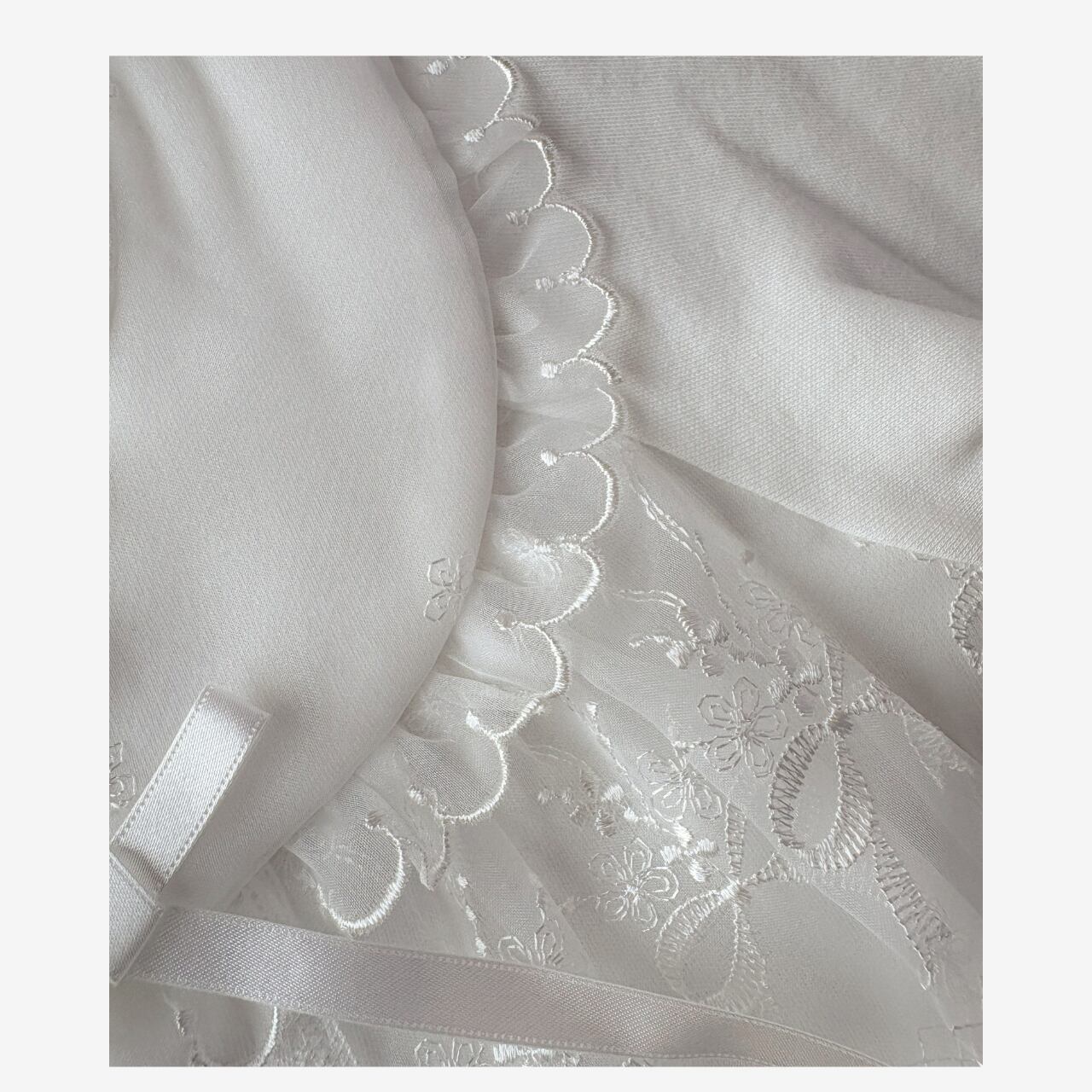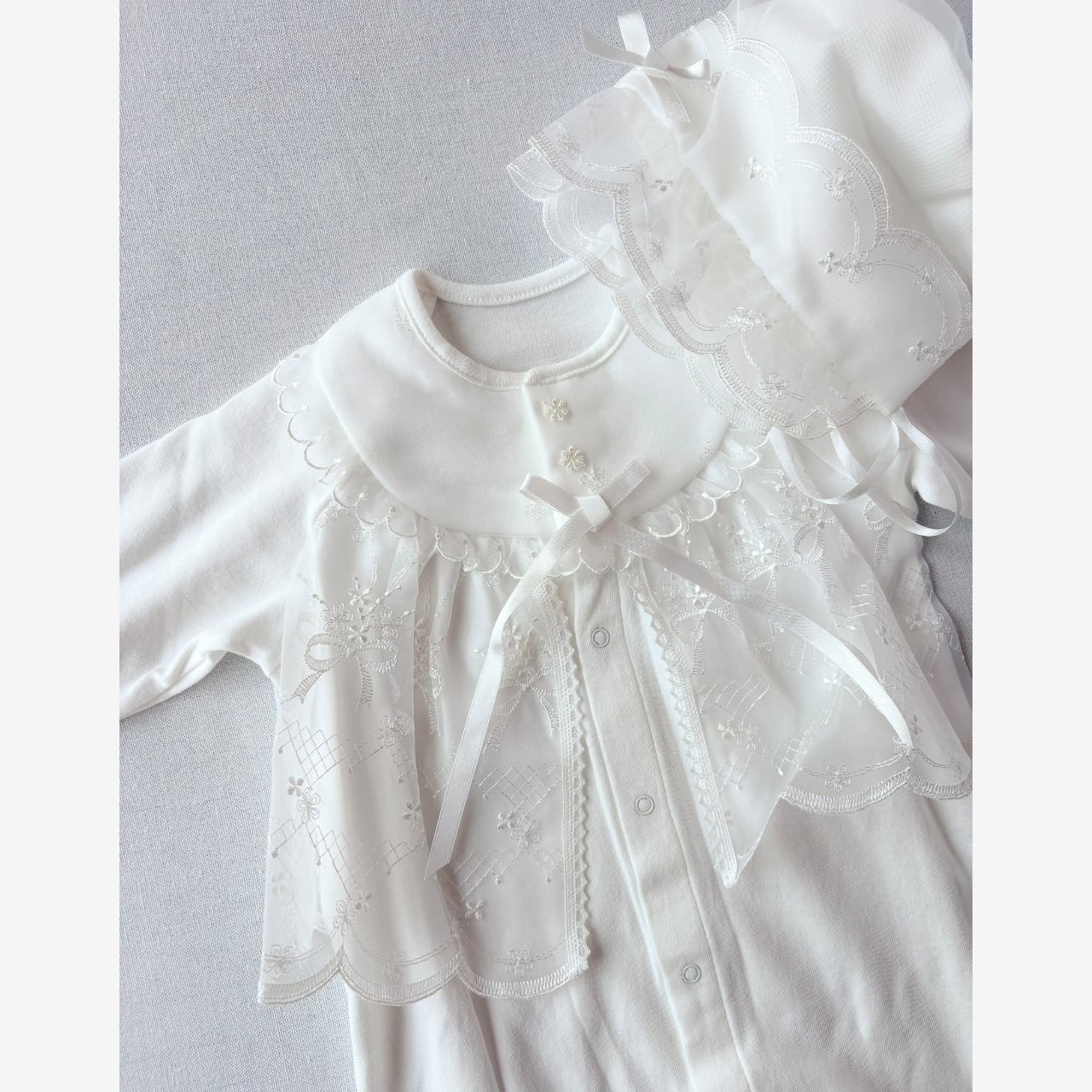 同デザインのリボン付き帽子と合わせて、統一感のある清らかなスタイルに。