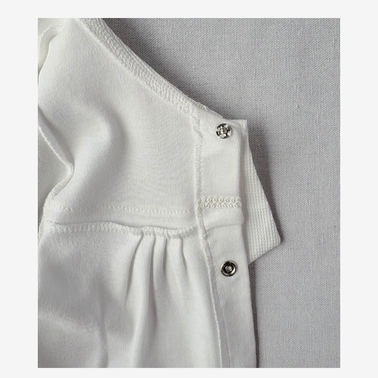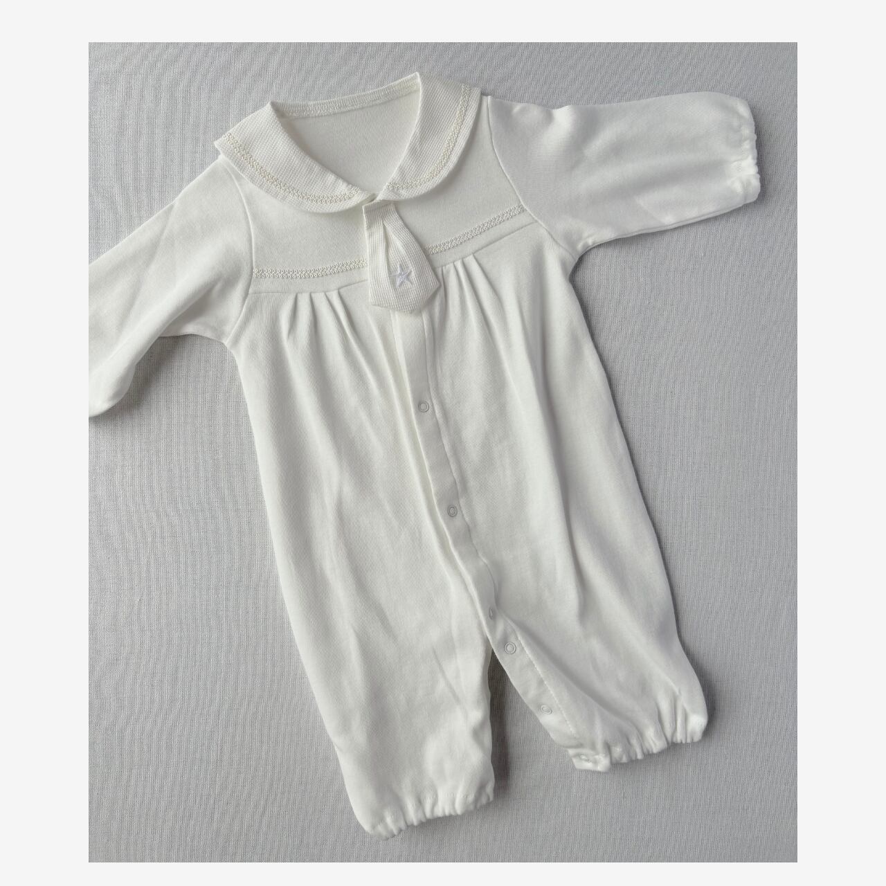 新生児期はドレスオールとして、2〜3ヶ月頃からは足元のスナップを留めてコンビロンパースとして着用可能。