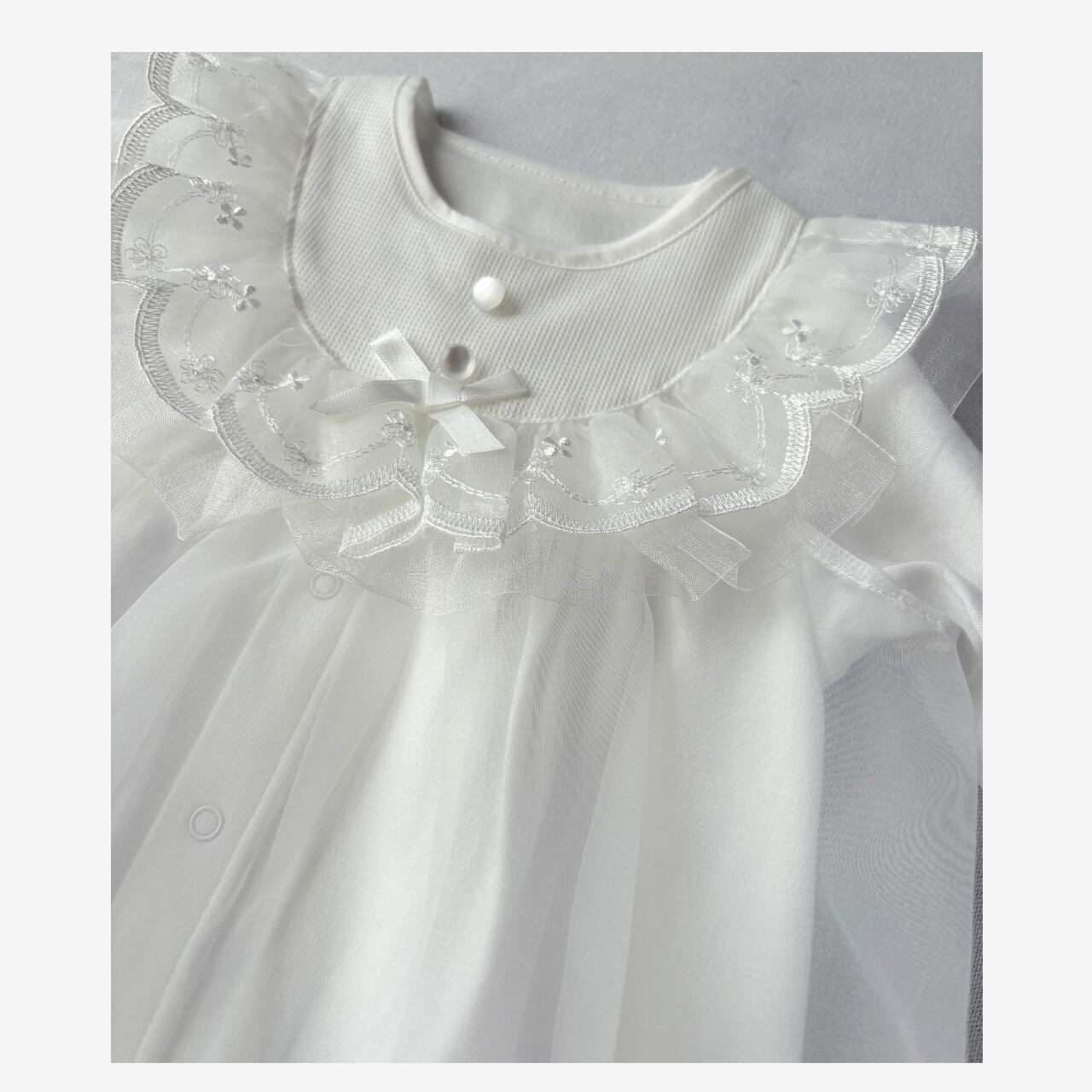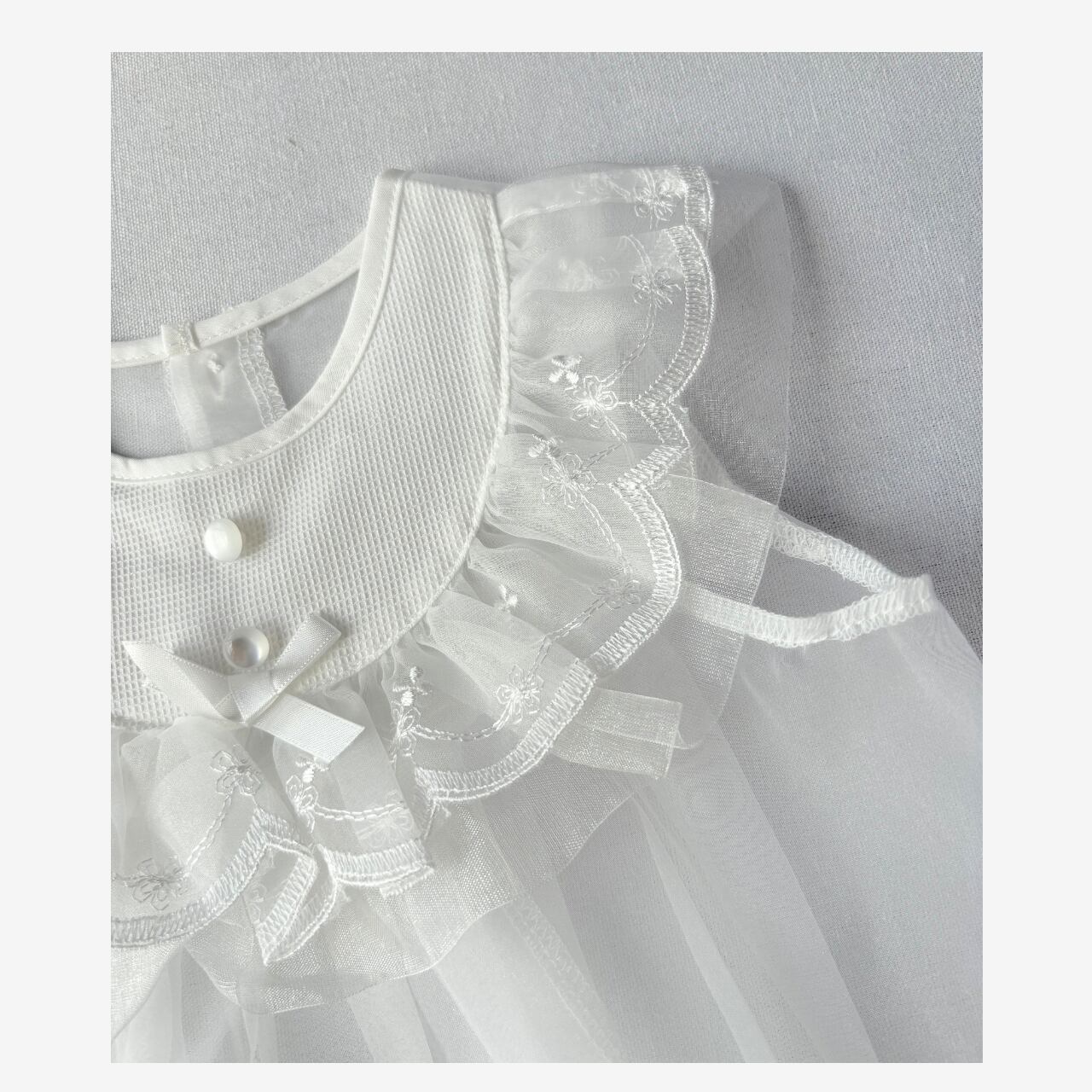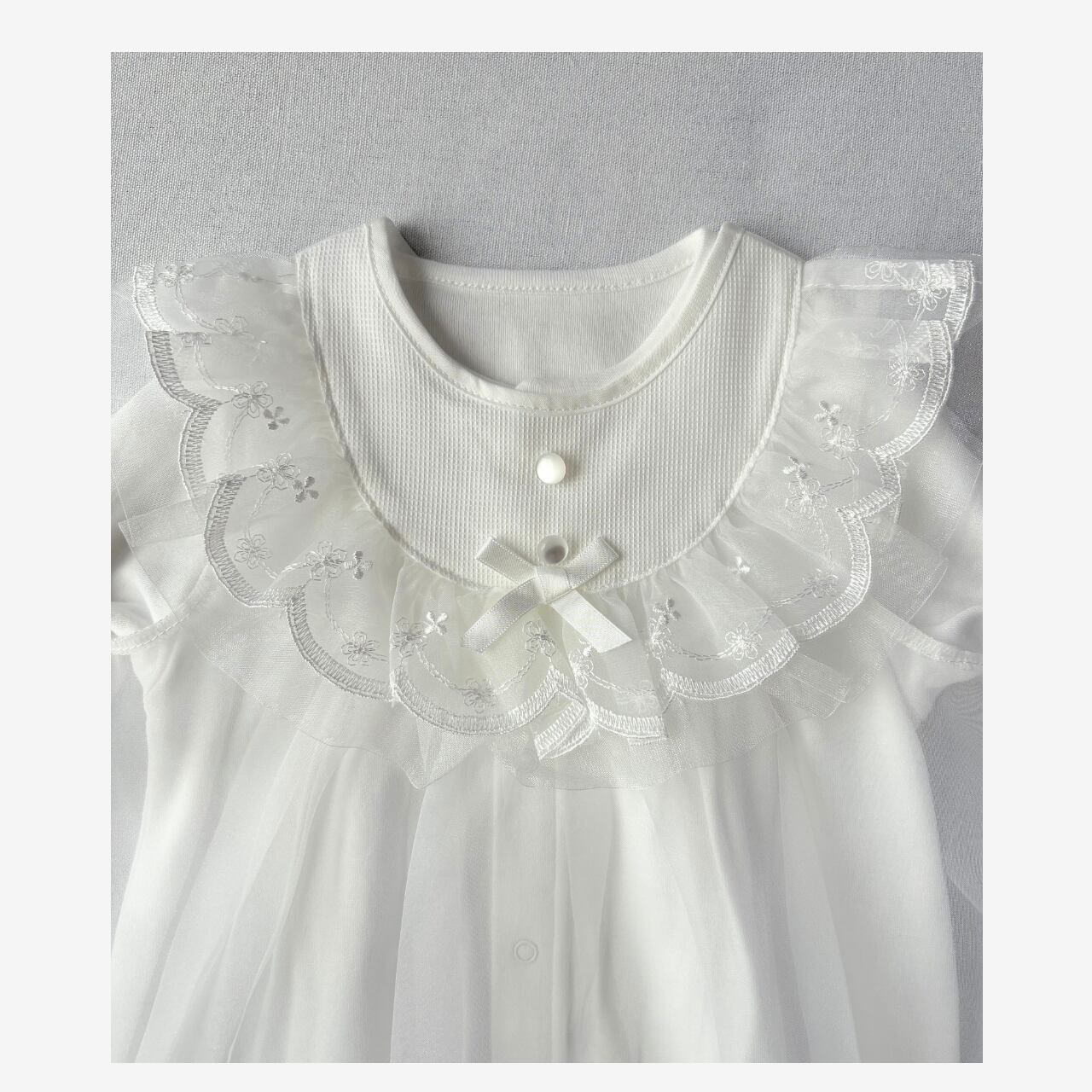 お顔まわりのスカラップレースはチュールと2重仕立てになっており、柔らかなボリューム感を演出。裾のリボン柄刺繍が上品な華を添えてくれます。