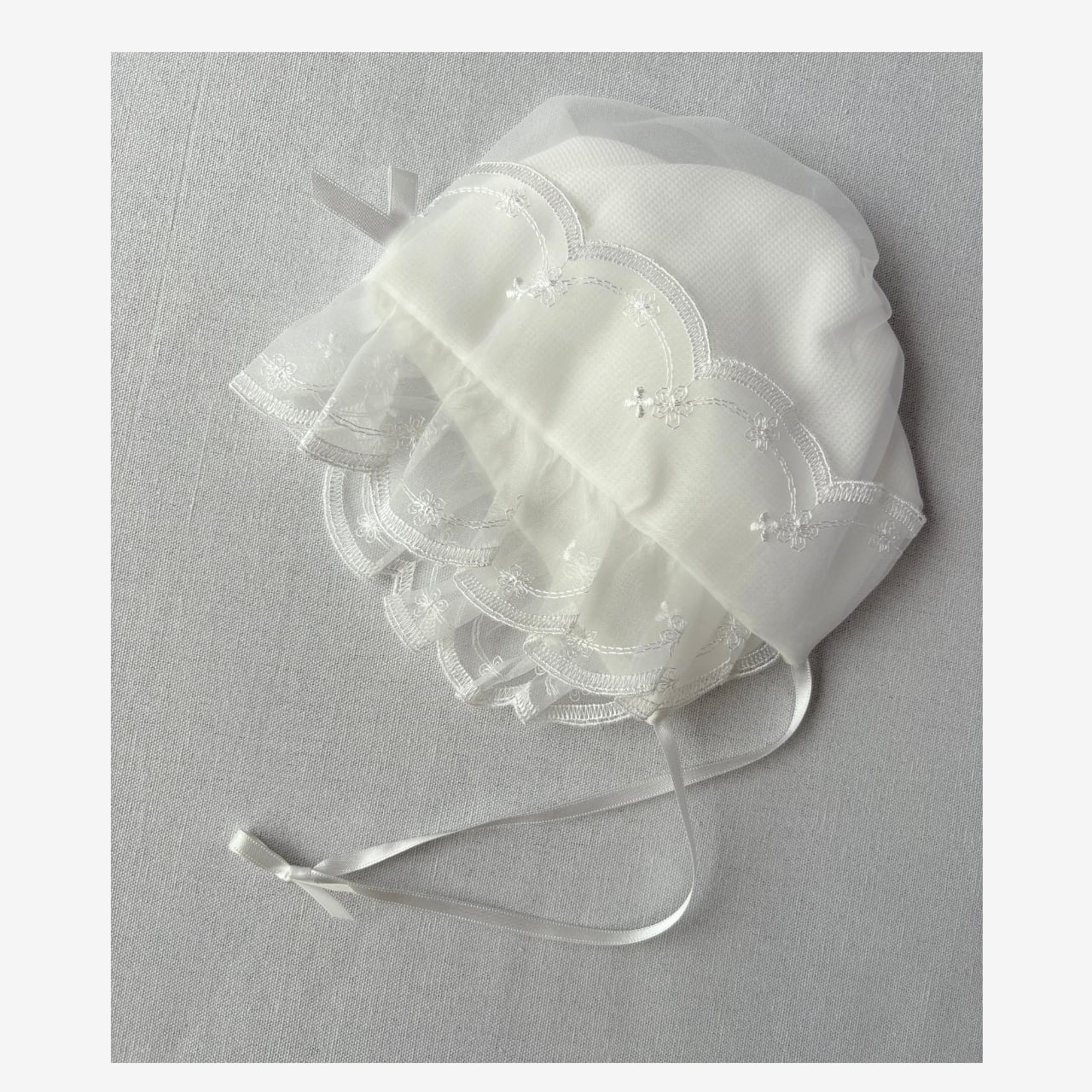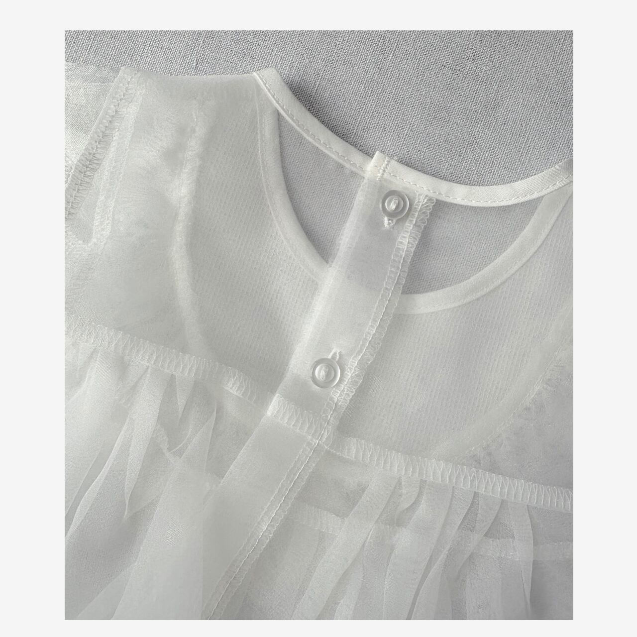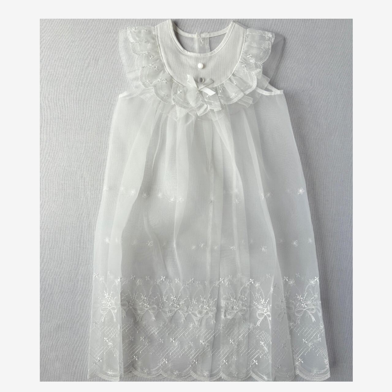 お顔まわりのスカラップレースはチュールと2重仕立てになっており、柔らかなボリューム感を演出。裾のリボン柄刺繍が上品な華を添えてくれます。