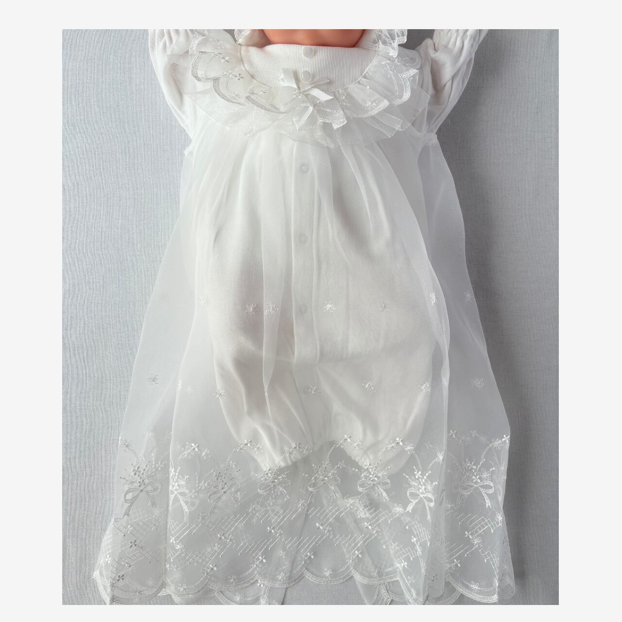ドレス部分が別仕立てになっているため抱っこした際にも繊細なレース刺繍が映え、華やかな印象に。