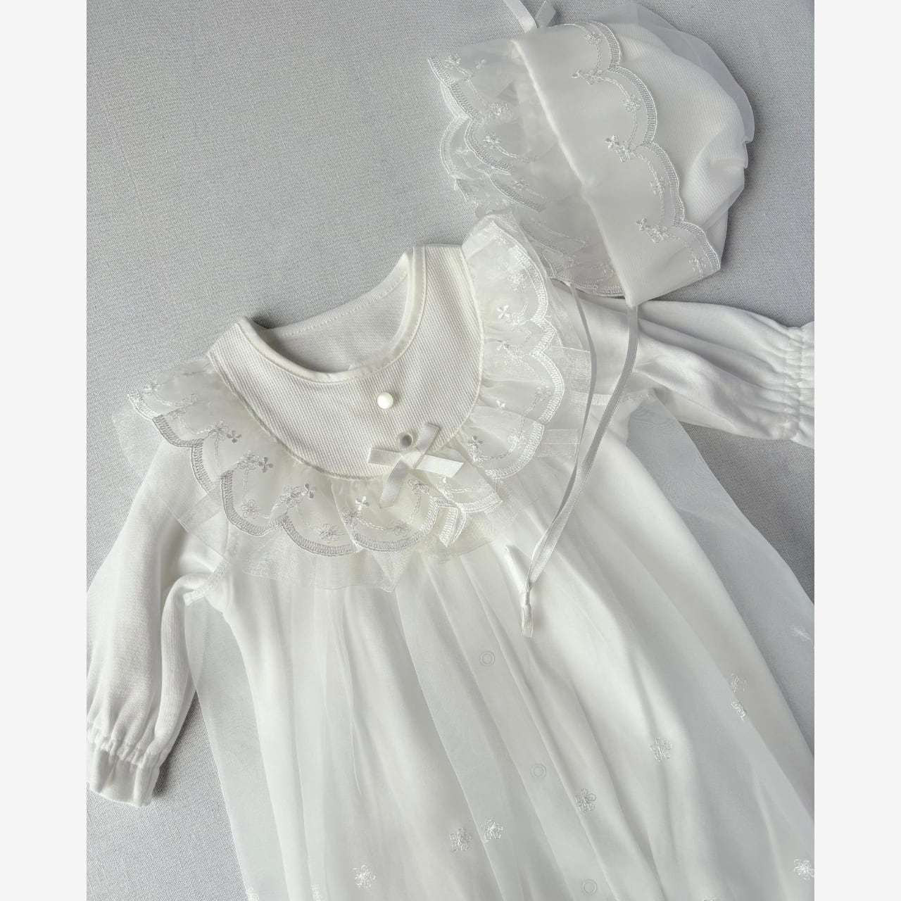 【ボタン&スカラップレースデザイン】日本製セレモニードレス3点セット|出産祝い・退院着・お宮参りに