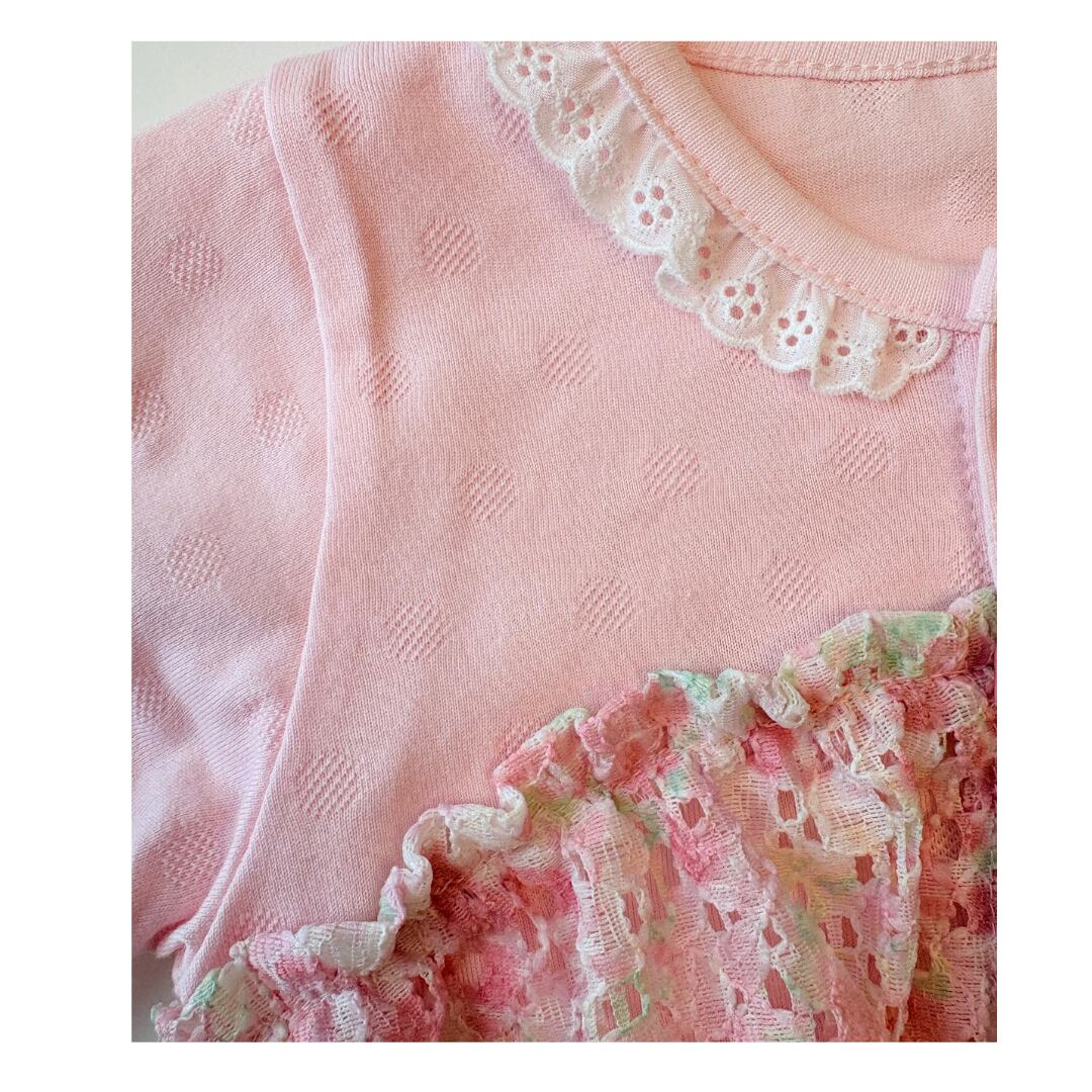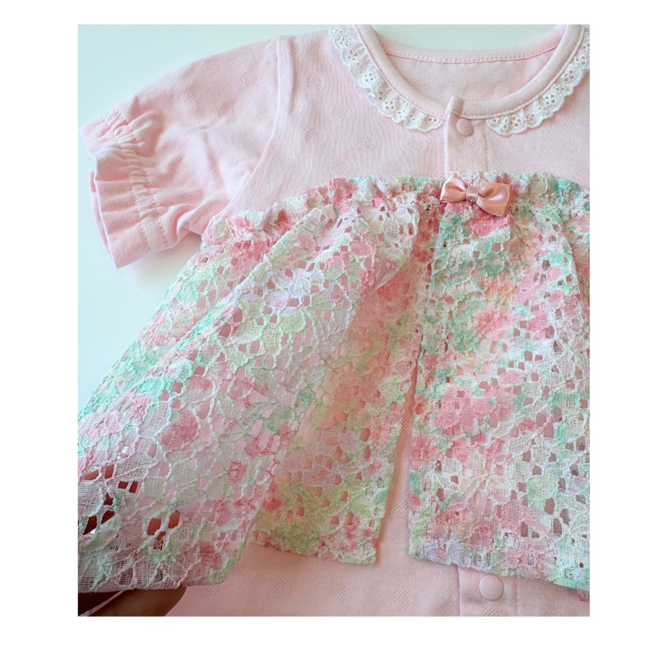 【ピンク】日本製花柄レース×ドット生地半袖カバーオール |春夏向け・70cm/80cm