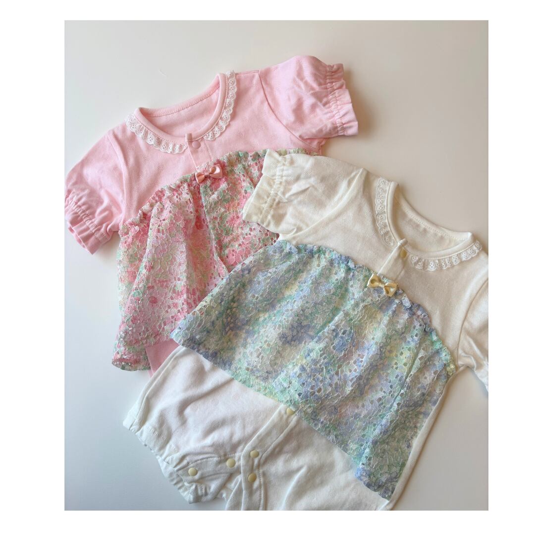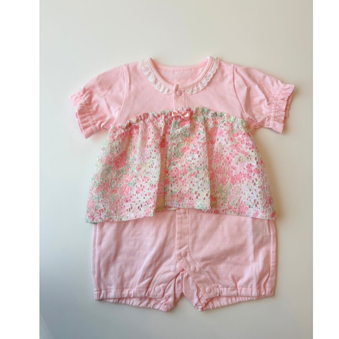 花柄レースに首元のフリル・リボンが華やかな、春夏にぴったりの半袖ロンパース。