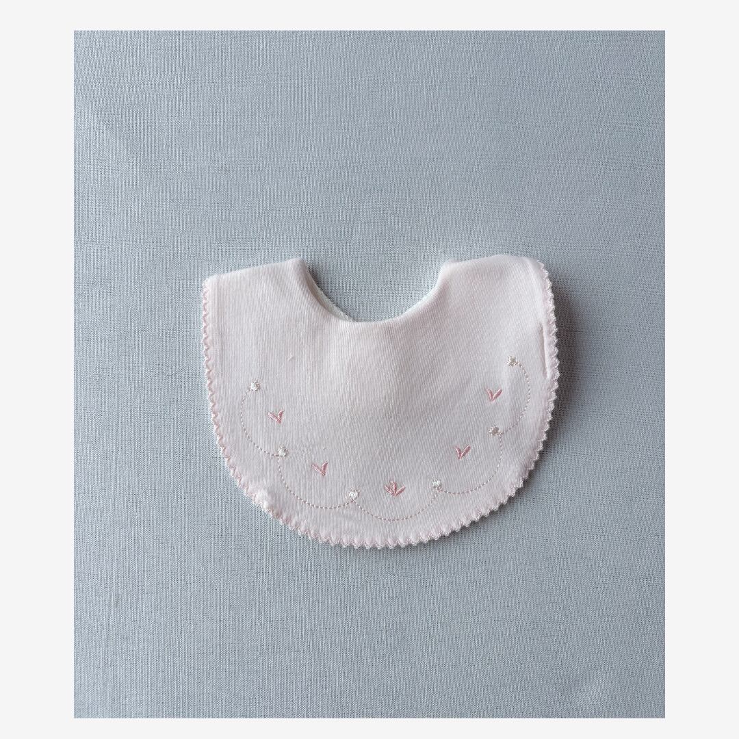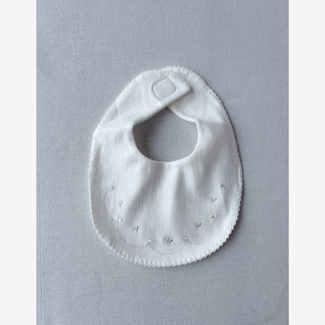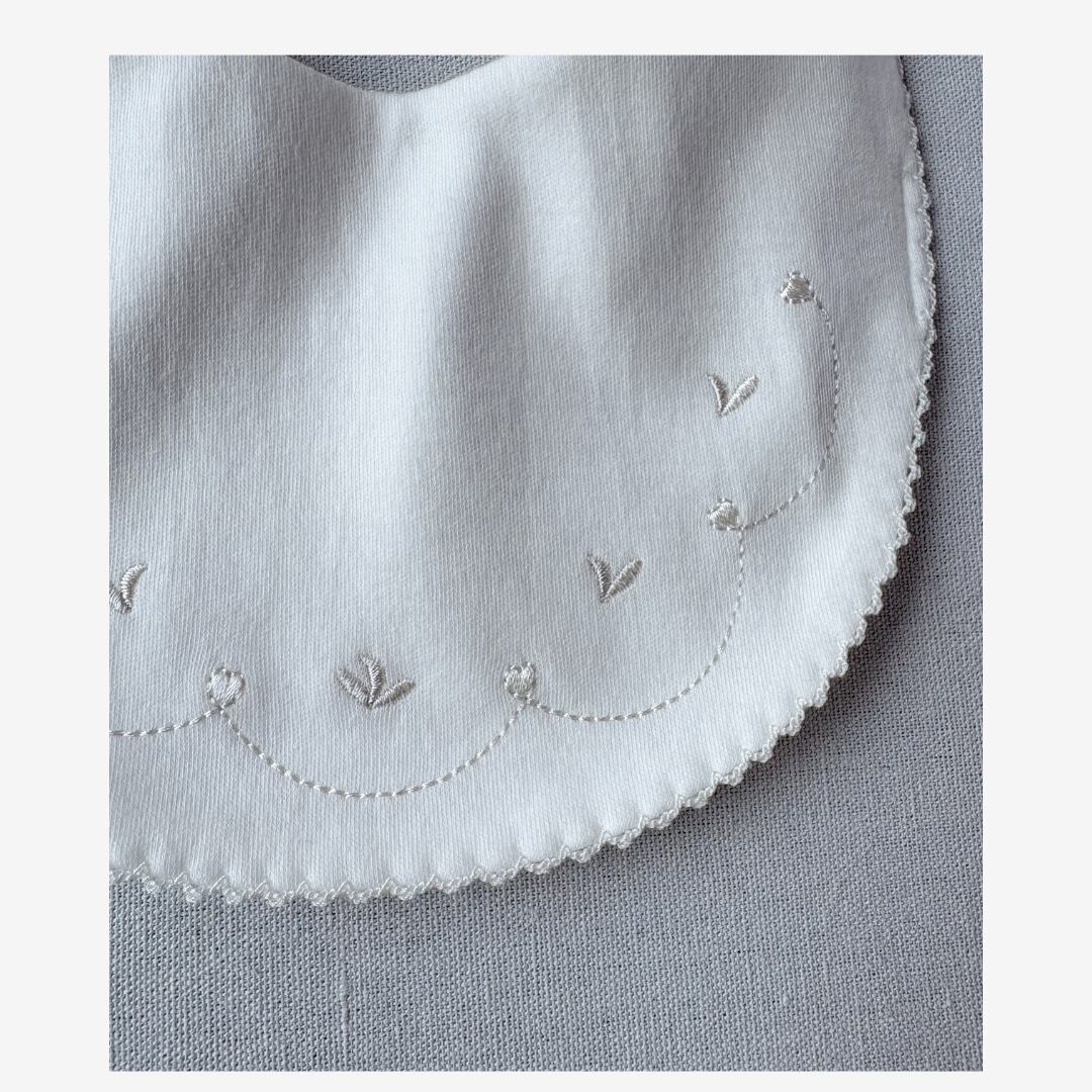 やさしい肌ざわりと刺繍が印象的な、新生児用のスタイです。