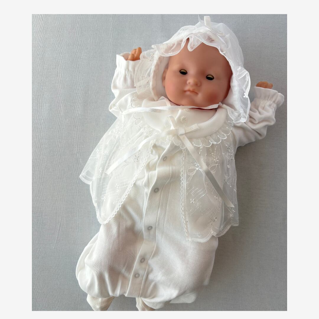フリルとリボンがさりげない可愛らしさで、セレモニーや退院時の装いにもぴったりな上品デザインです。
