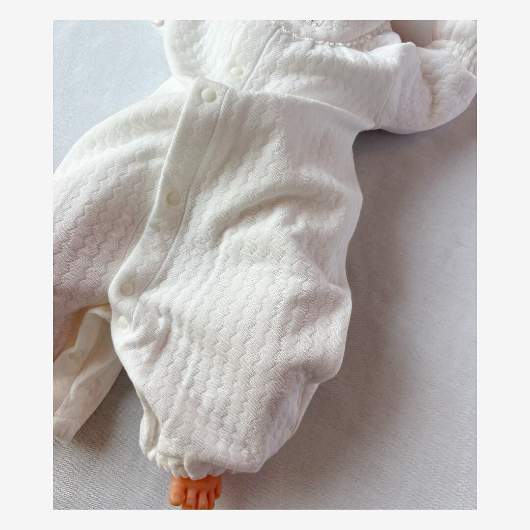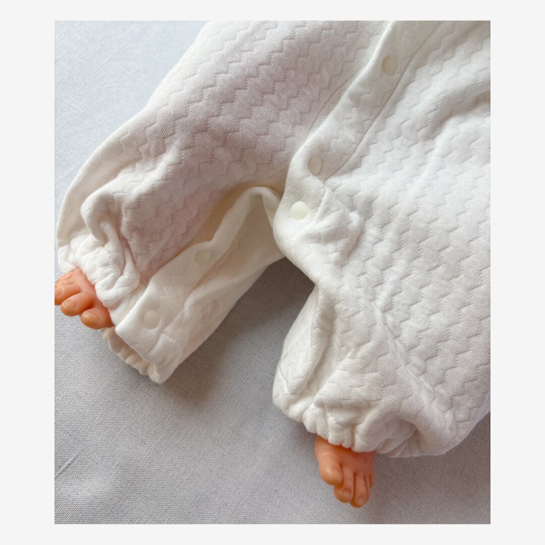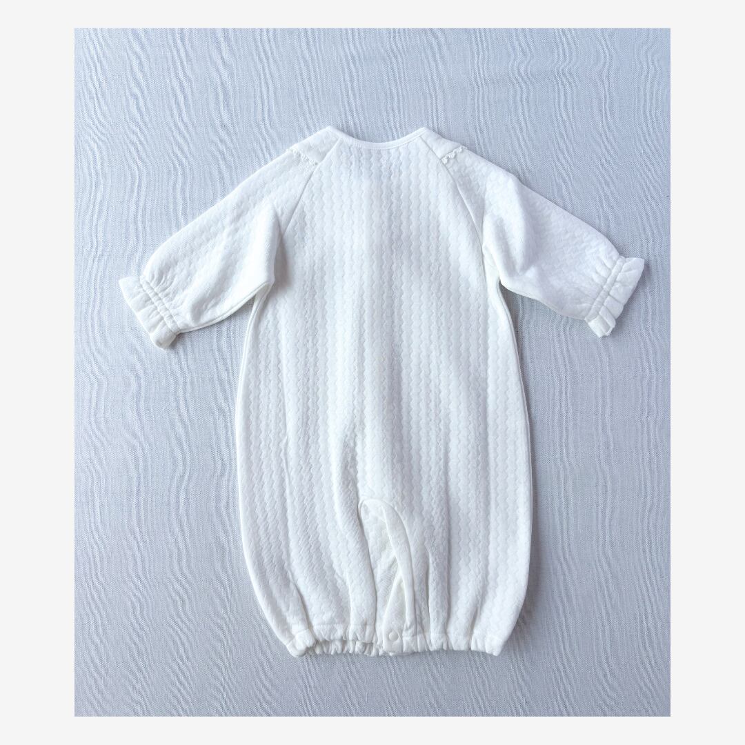 新生児期はドレスオールとして、足がよく動くようになる2〜3ヶ月頃からは足元のスナップを留めてカバーオールとしても着用可能。