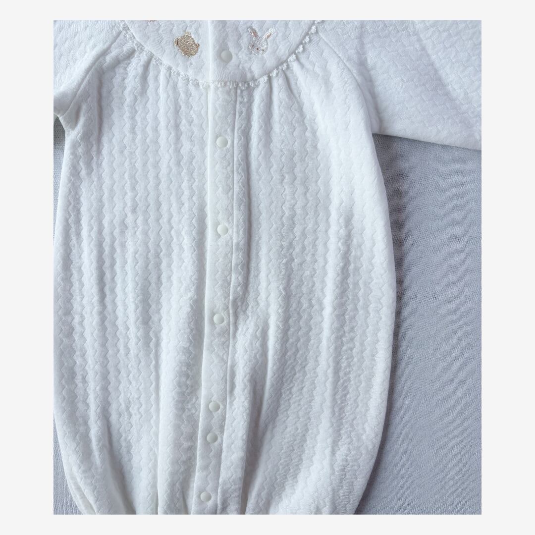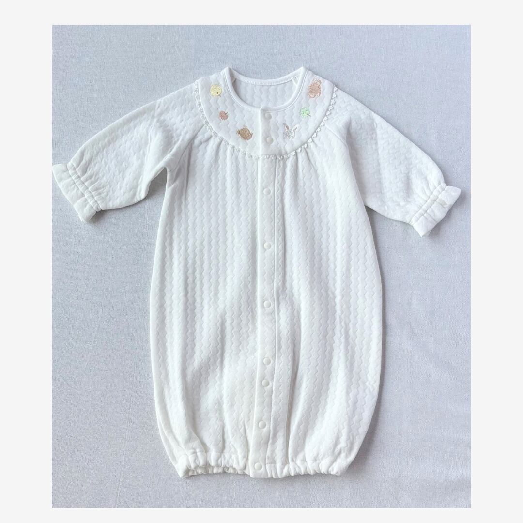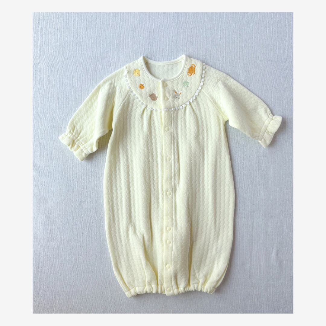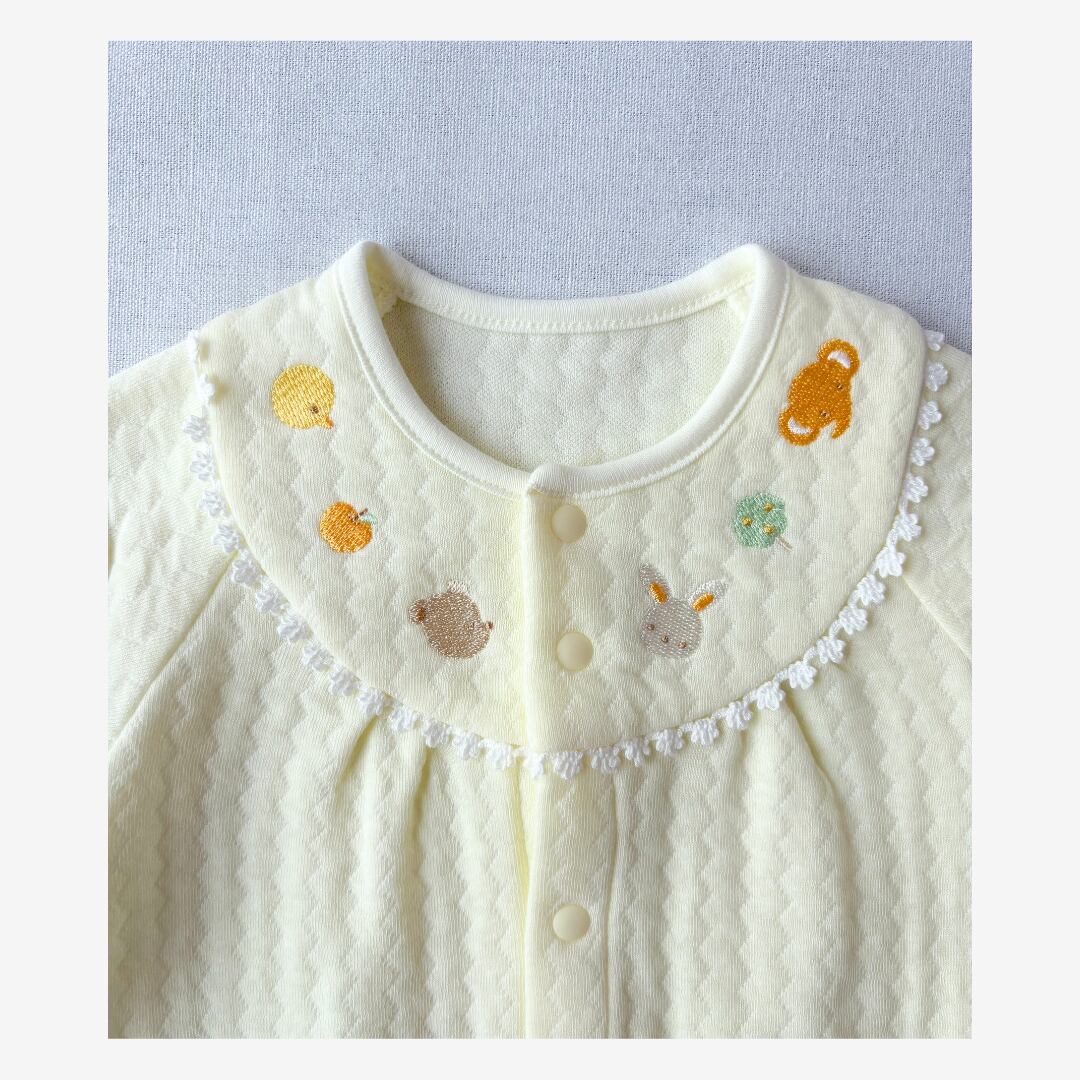 胸元には、優しい表情のひよこ・くま・うさぎ・ぞうの刺繍。