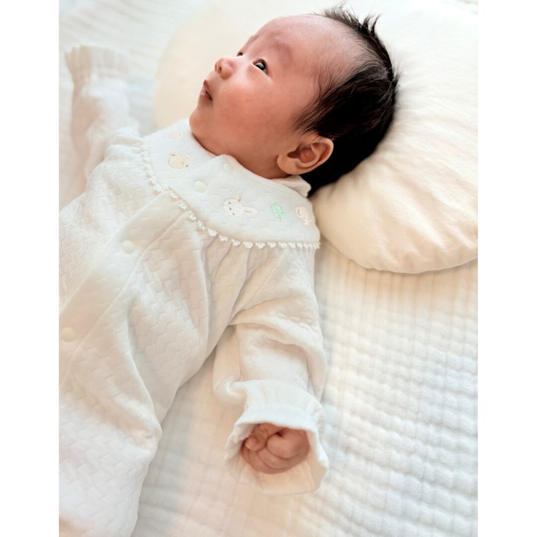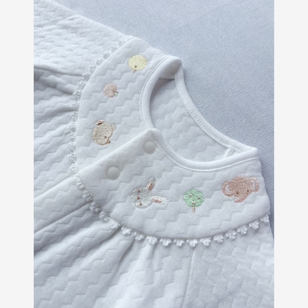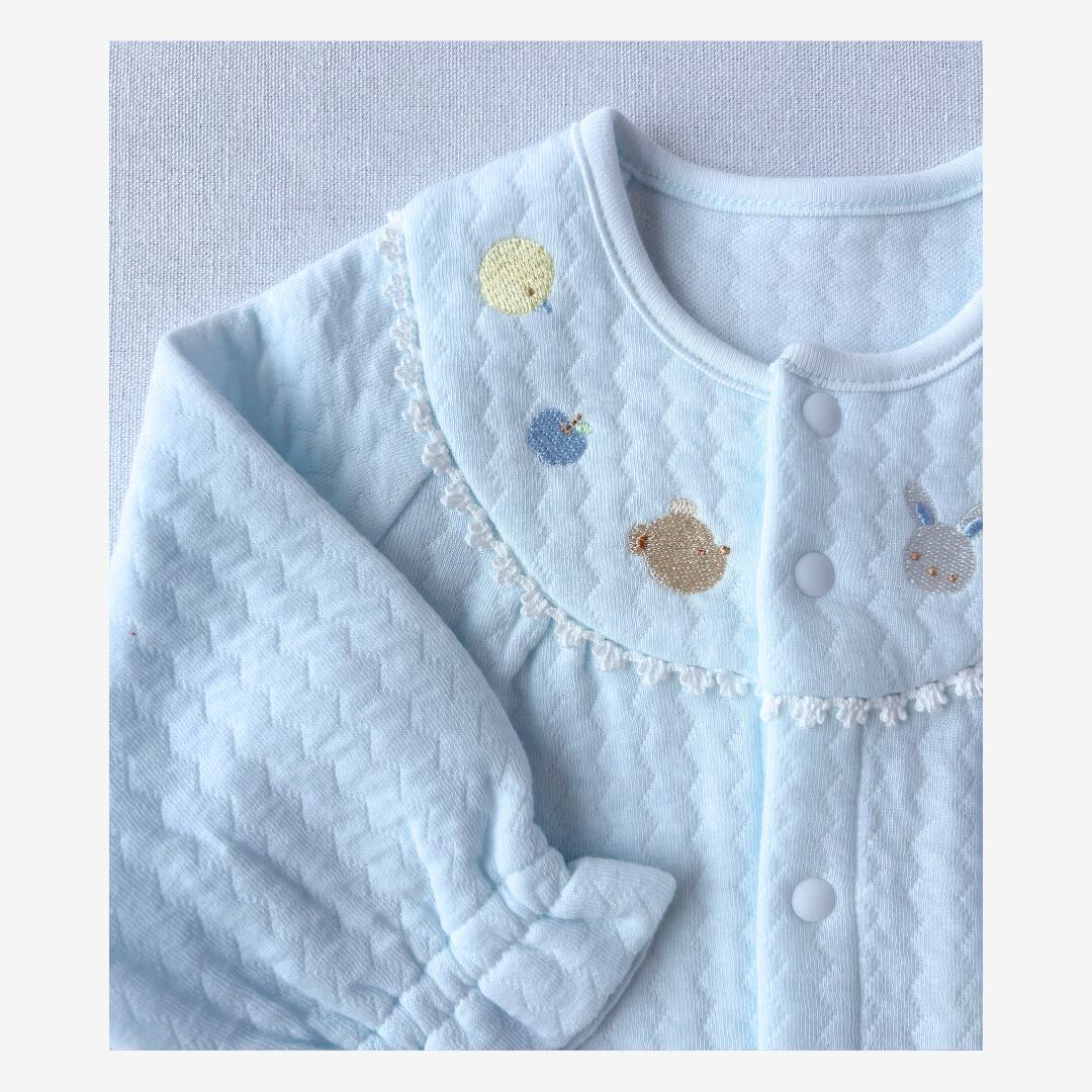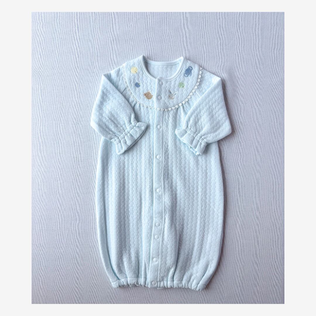 胸元には、優しい表情のひよこ・くま・うさぎ・ぞうの刺繍。