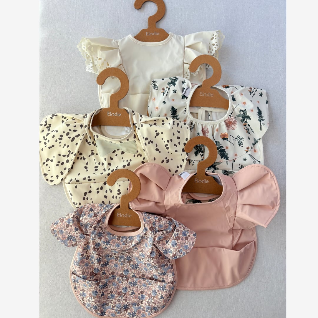 大人気Elodieのお食事エプロン。新作のBlue Garden Lightは柔らかな色彩の花柄がとても上品で優しい印象で、店主一押しの一枚です。お揃いの柄のおむつポーチもご用意しておりますので、親子でリンクコーデを楽しむのもおすすめ。