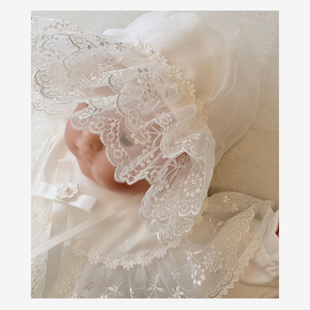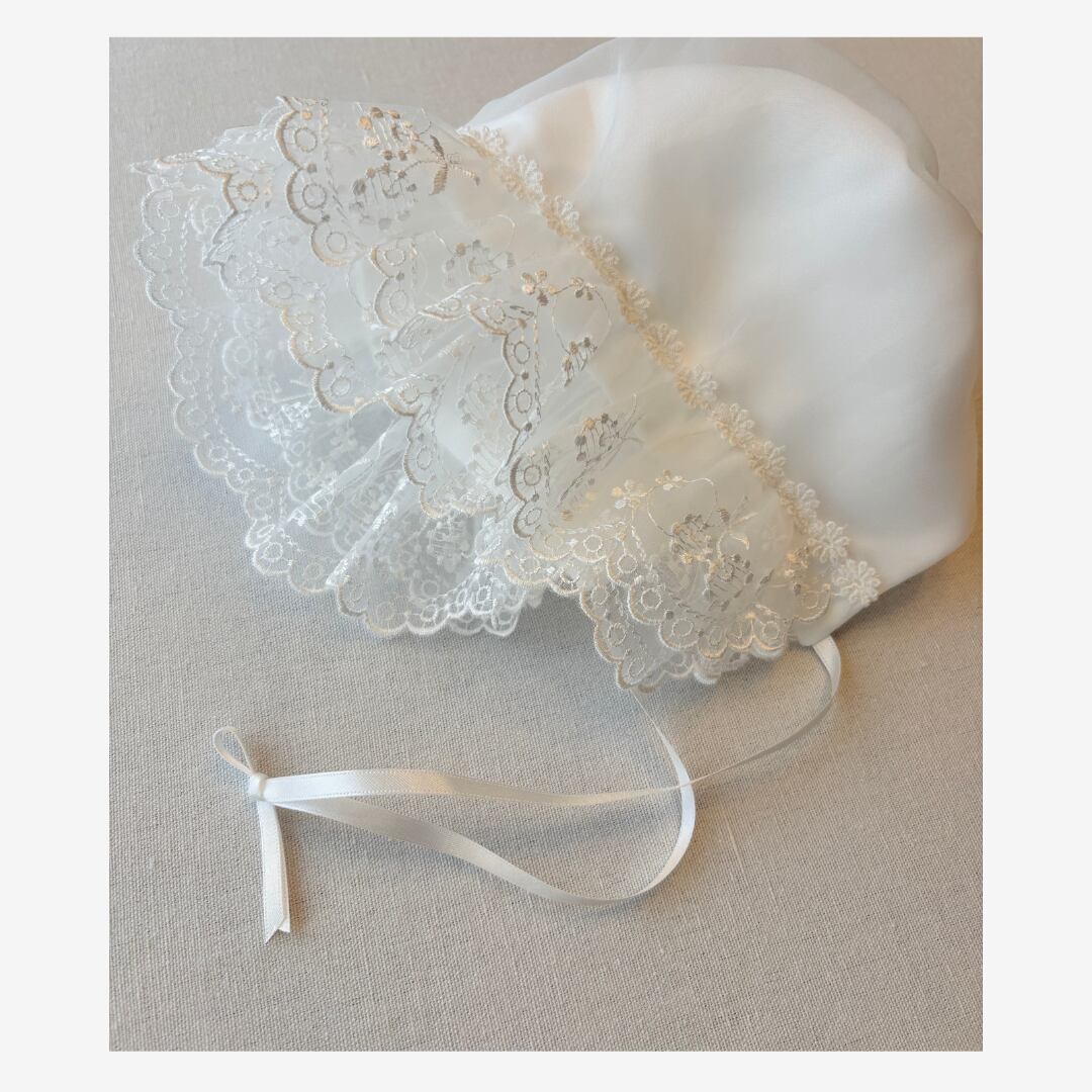 お揃いの帽子にもレースをふんだんに使用し、お顔まわりにやさしいボリューム感を。