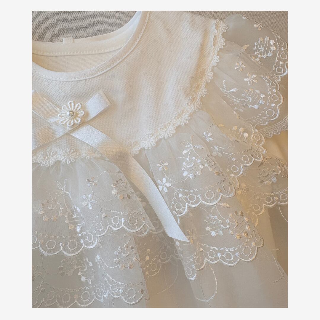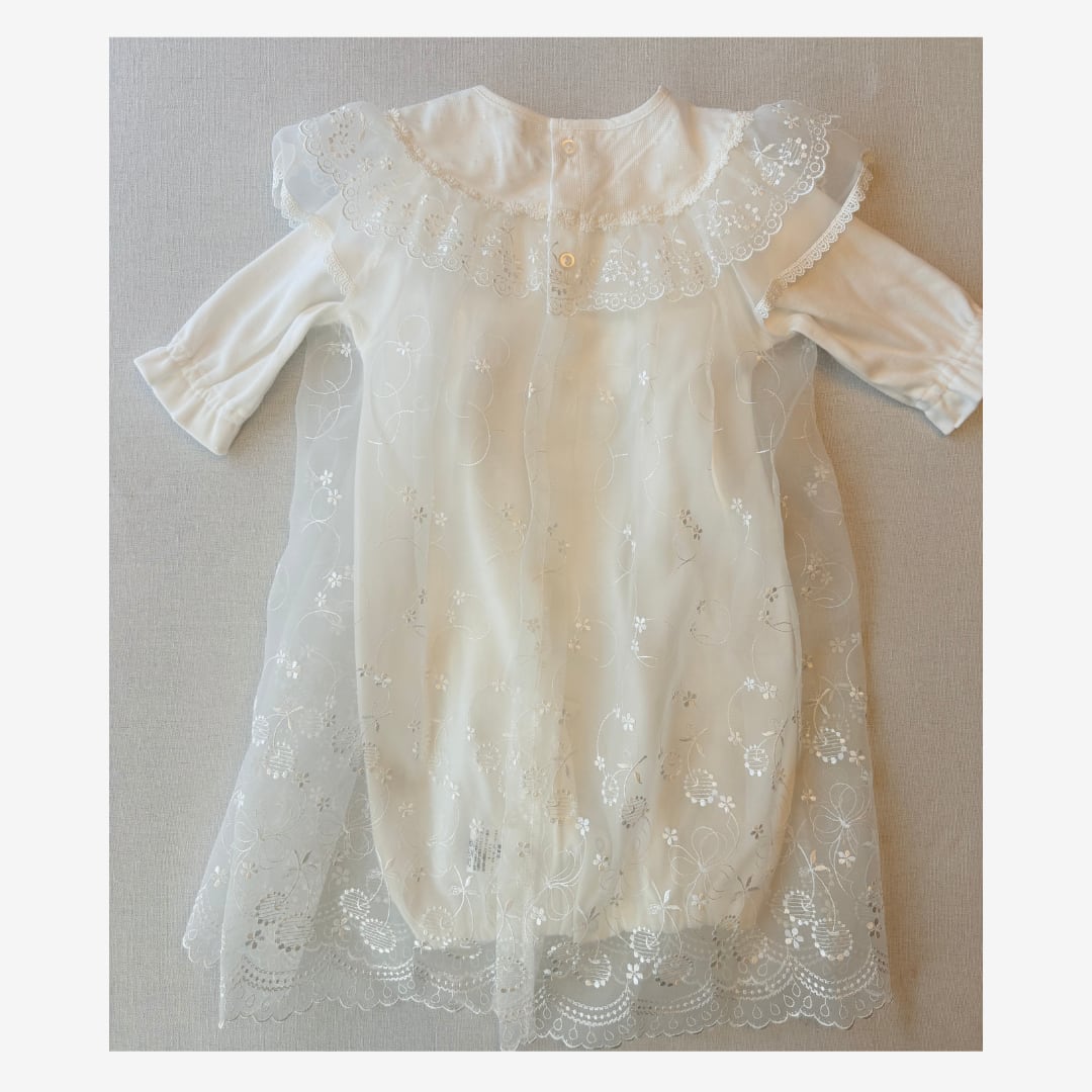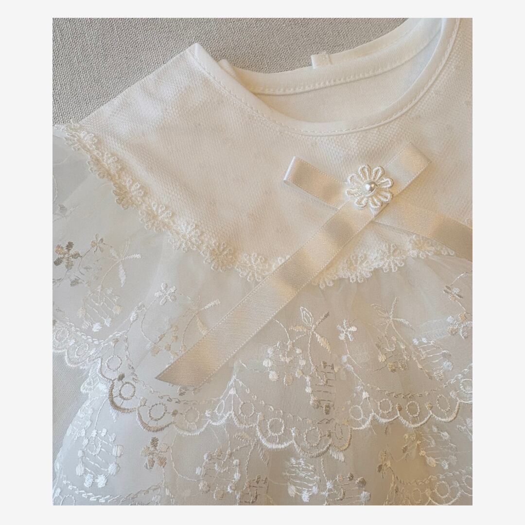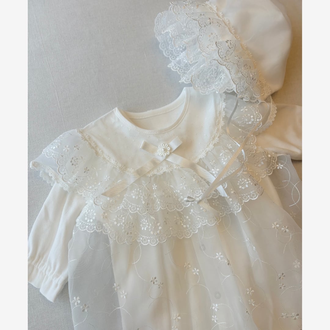ドレス部分が別仕立てになっているため抱っこした際にも繊細なレース刺繍が映え、華やかな印象に。