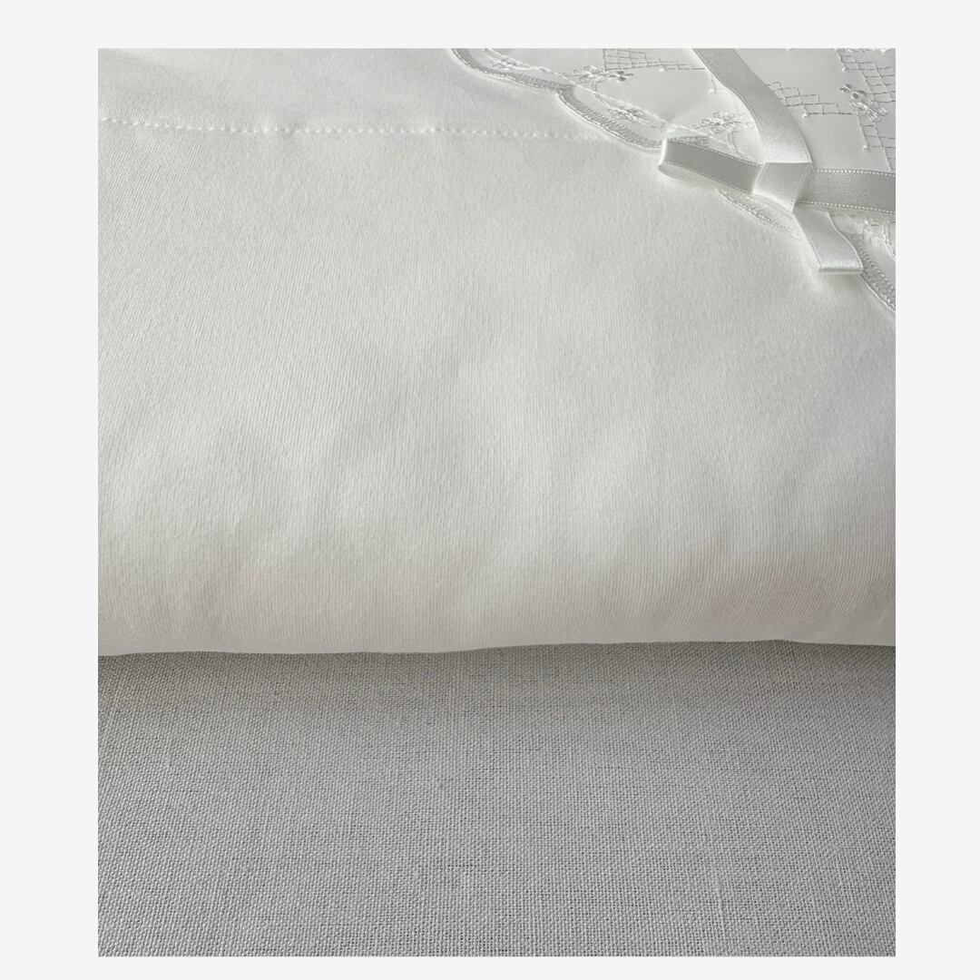 日本製のリボンレース刺繍が特別感のあるおくるみです。