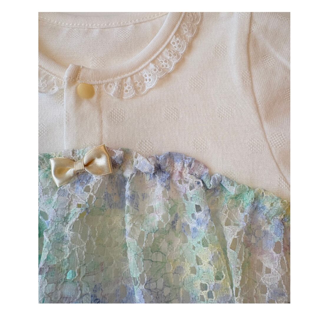 透け感のあるドット生地と、ぽわんとした袖口のデザインが、赤ちゃんの可愛らしさを引き立てます。