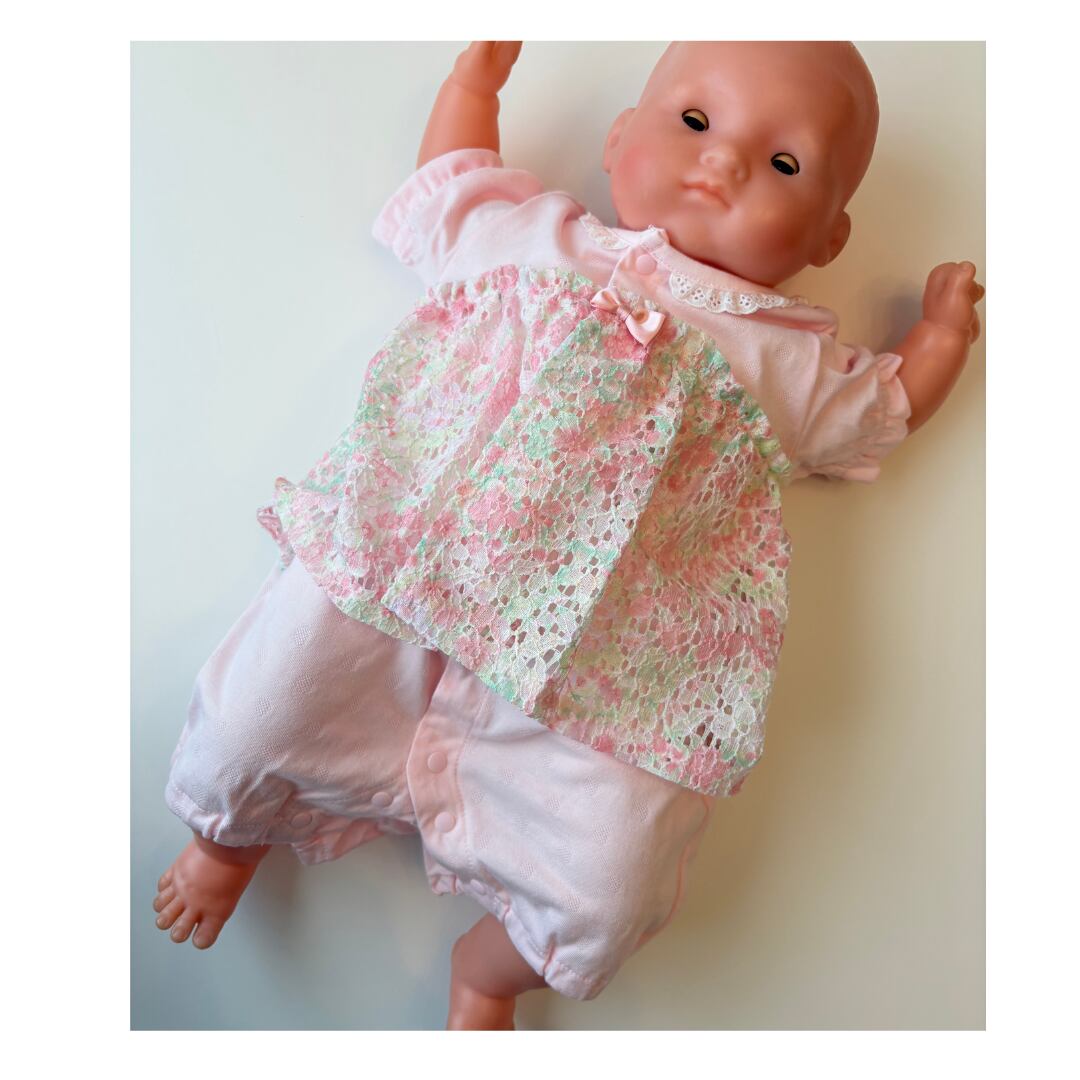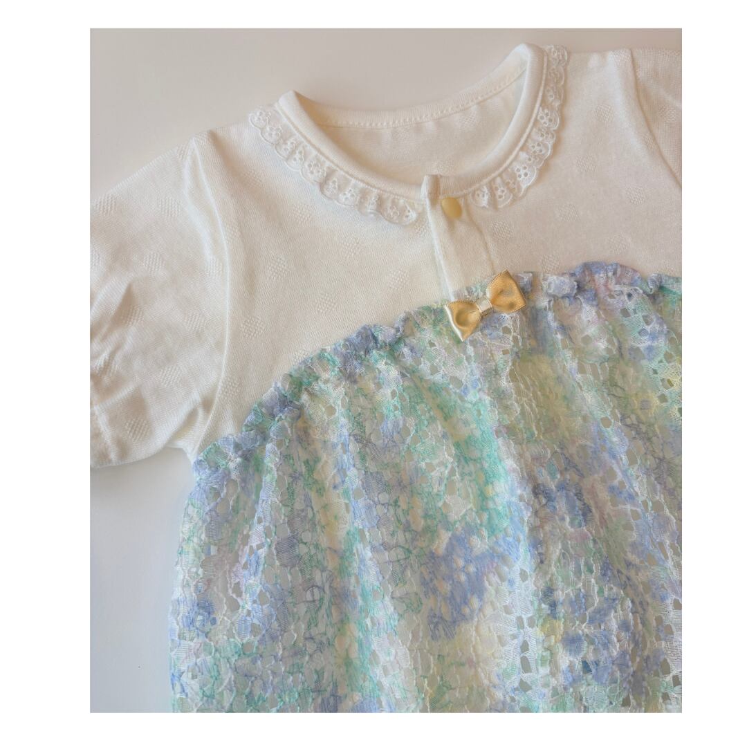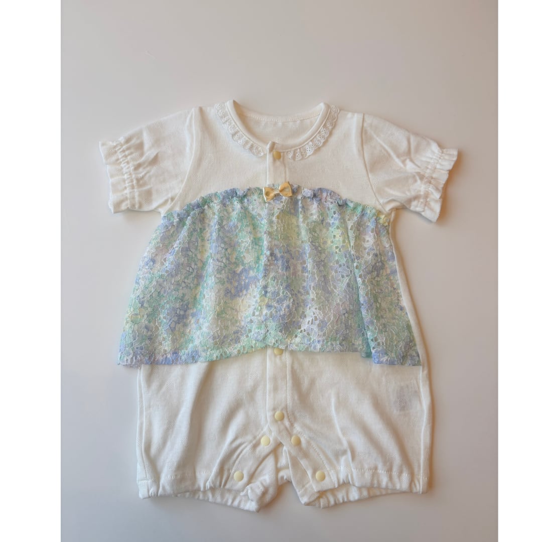 花柄レースに首元のフリル・リボンが華やかな、春夏にぴったりの半袖ロンパース。
